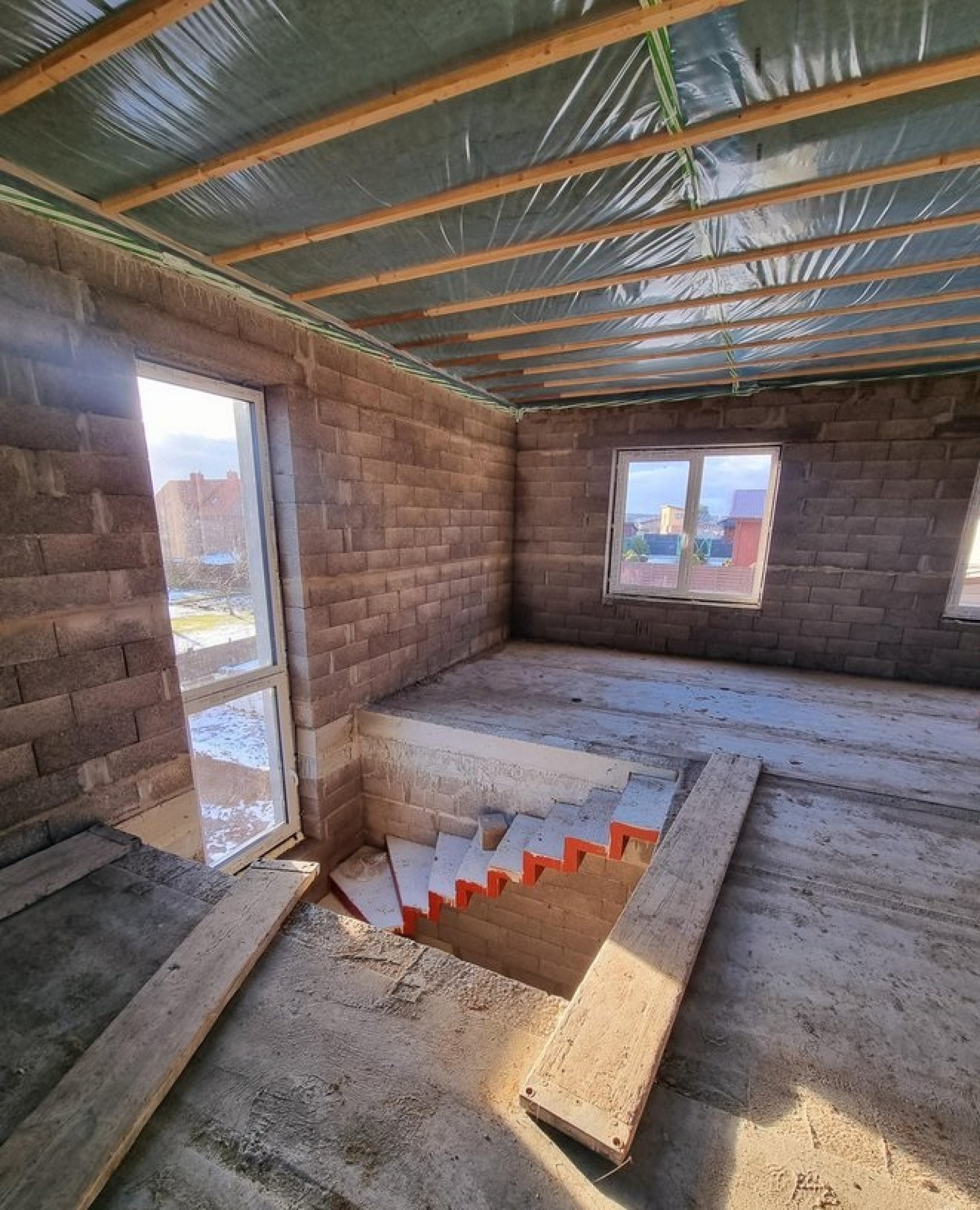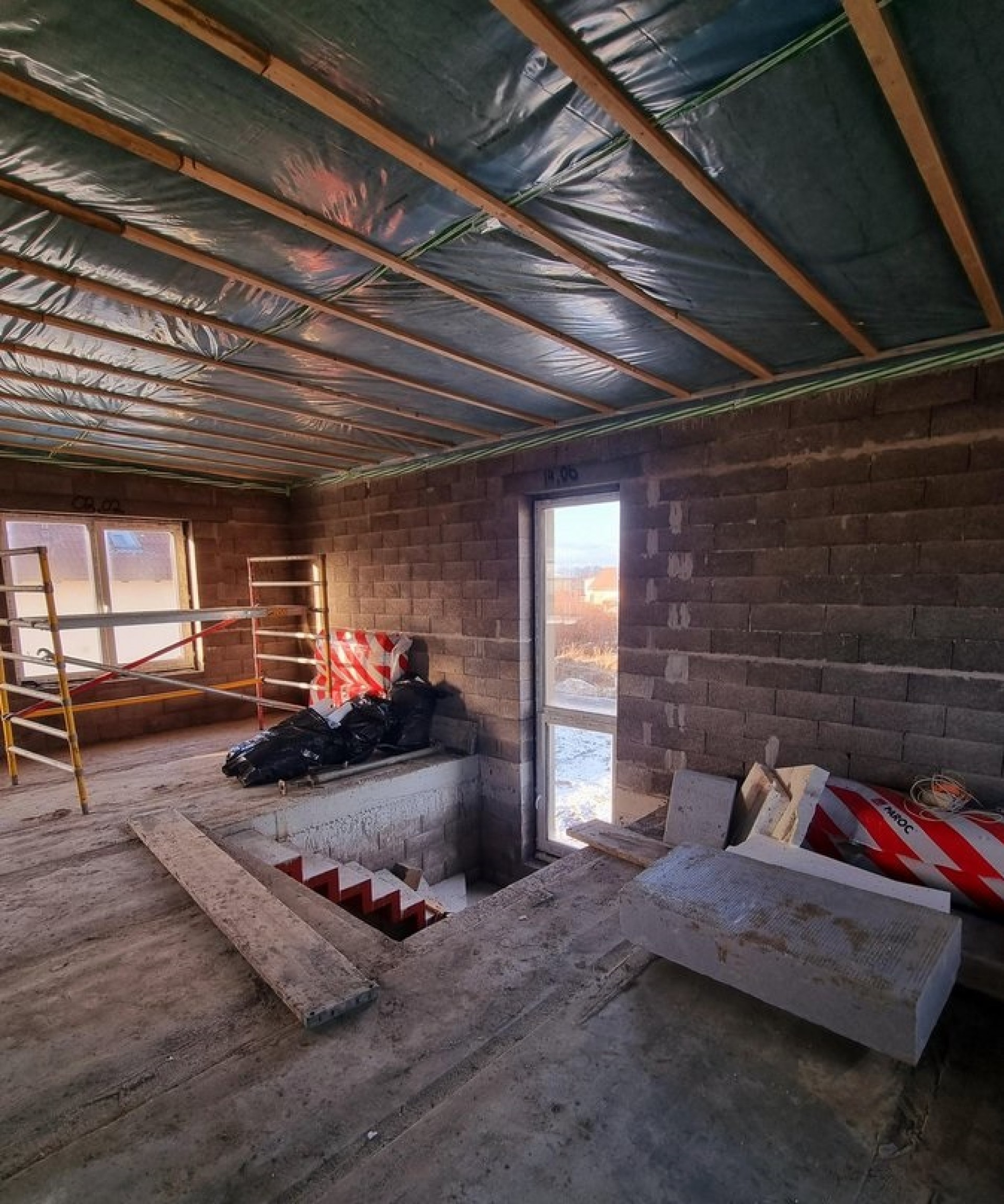 Į dalinę apdailą įeina modernus pilnas namo fasadas (vietomis uždėtas dekoras, kitur medinės fasadinės dailylentės arba meldorfer plyteles), HS sistemos terasiniai langai kiemo pusėje, sutvarkytas gerbūvis (tvora, išlygintas augalinis sluoksnis, trinkelės). Viduje: pirmas elektros instaliacijos etapas, santechnika, išvedžiotas grindinis šildymas, išbetonuotos grindys, įrengtos pertvaros, ištinkuotos sienos, rekuperacinės sistemos vamzdyno išvedžiojimas.
