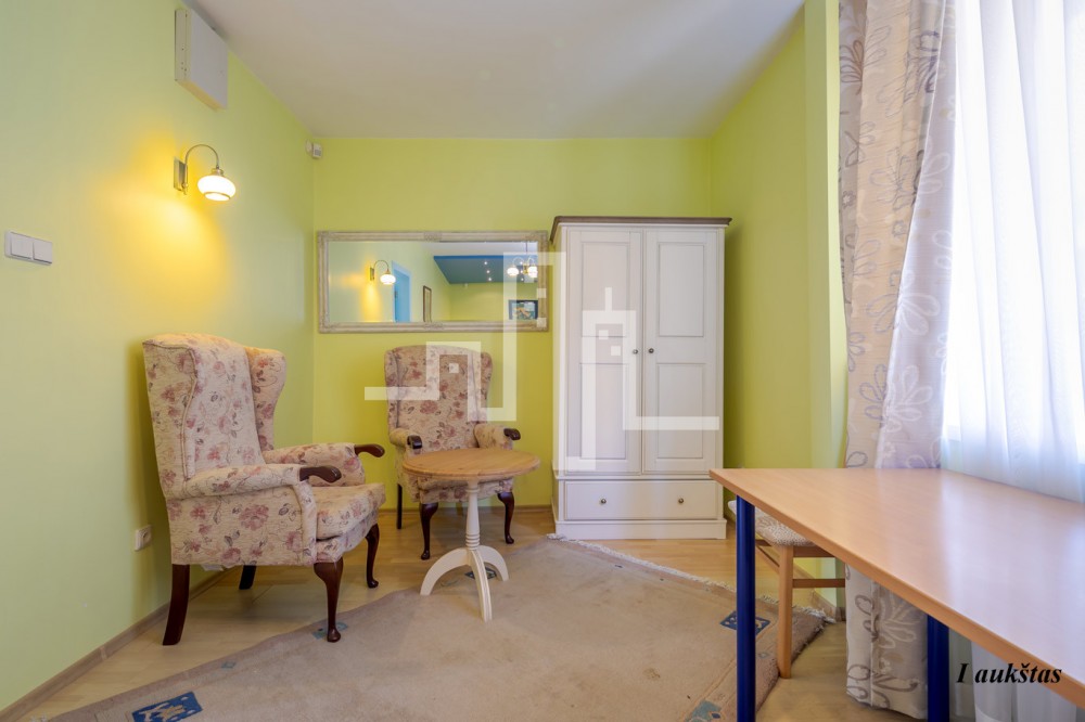 Bendrai parduodamo žemės sklypo ploto dalis - 4 a., namo dalis 266,10 kv.m.Teritorija aptverta tvora, sumontuoti vartai. Likęs plotas apželdintas. Lengvai pasiekiama dviračiu ar automobiliu, patogus privažiavimas asfaltu iki sklypo, garažas bei automobilių stovėjimo aikštelė trims automobiliams visos komunikacijos: miesto vandentiekis ir kanalizacija, elektra. Name įrengta pirtis ir baseinas, įrengtos miegamos vietos iki 10 žmonių. Gatvė labai rami ir važiuojama tik gatvės gyventojų. Namo teritorija aptverta metaline tvora, apželdinta, išklota trinkelėmis, didelė automobilių aikštelė. Kieme 1998 metų statybos registruota rankų darbo akmeninė lauko pavėsinė čerpiniu stogu su natūralaus medžio lauko baldais. Prie namo taip pat yra lauko terasa su markize ir naujais metaliniais kalvio darbo turėklais. 2008 metais namo išorė ir vidus buvo renovuoti. Padaryta fasado apdaila, pakeista stogo danga. Viduje atliktas kapitalinis remontas, pakeisti vamzdynai elektros instaliacija. Namo išplanavimas labai erdvus, kambariai dideli ir šviesūs. Nereikia papildomų investicijų, nebent pakeisti baldus pagal poreikį. Namo rūsyje galingas JUNKERS dujinis katilas. Parduodamas su visais baldais, originaliais paveikslais ir technika. Namas renovuotas 2000m, padengtas naujas skardinis stogas.Papildomos patalpos, baseinas, garažas, pirtis, rūsys, terasa. Papildoma įranga: skalbimo mašina, su baldais, šaldytuvas, šildomos grindys, virtuvės komplektas, viryklė, židinys, plastikiniai vamzdžiai, indaplovė. Aptverta teritorija, signalizacija.