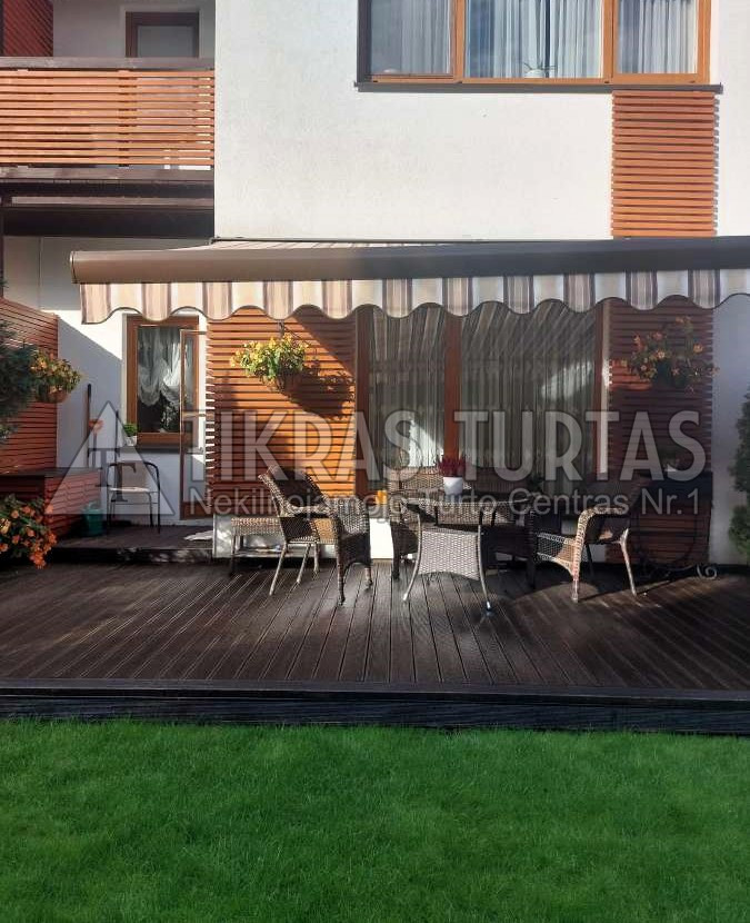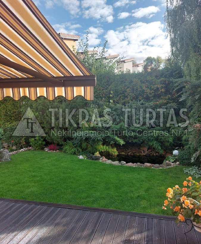 Kiemelis su didele medinė lauko terasa, yra markize, lauko baldais, kepsnine, išpuoselėta augmenija, alpinariumas.