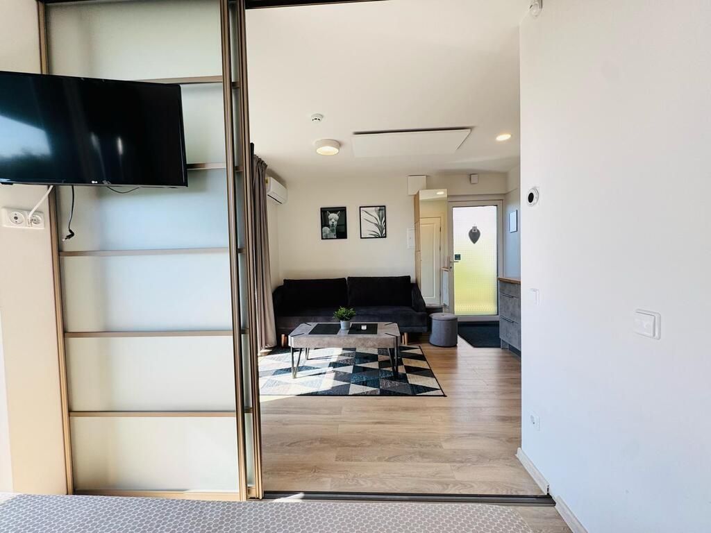 Funkcionalus išplanavimas: nors butas laikomas vieno kambario, miegamoji zona atskiriama stumdomomis durimis, todėl patalpa lengvai transformuojama į dviejų kambarių erdvę.