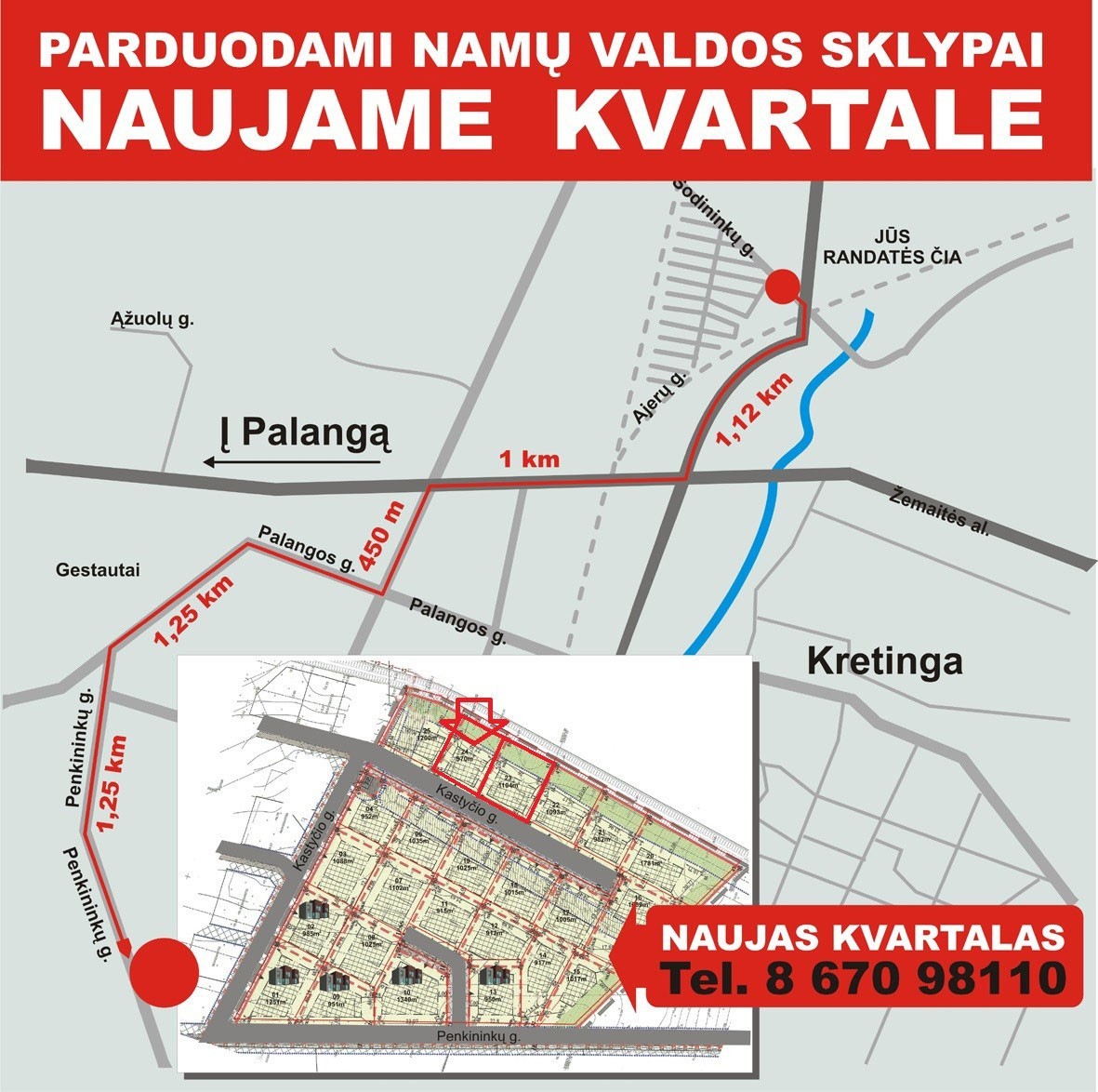 GERAS PASIULYMAS Kretingoje 9.70 arų TIK 11640 €. Kretingos mieste, Kastyčio g. 8J parduodamas 9.70 arų namų valdos sklypas mažaauksčių gyvenamųjų namų statybai. Išduodami leidimai namo statybai su vietiniais valymo įrenginiais ir išgriebiamąją duobe, galima statyti dviejų su mansarda iki 10 metrų aukščio gyvenamąjį namą su leistinu iki 30 procentų žemės sklypo užstatymu. Aštuoni sklypai iš dvidešimt keturių yra parduoti ir ant septynių sklypų jau stovi pastatyti namai ir įsikurė pirmieji naujakuriai. Sklypas randasi ant nedidelio šlaito iš kurio atsiveria gražus vaizdas į rytus ir pietus kur teka bevardis upelis, šlaito apačioje puiki galimybė pasistatyti pirtį. Prie sklypu išpiltas sauso asfalto dangos kelias, atvesta elektra ir pastatytos elektros dėžės. Parduodamo namų valdos 9.70 arų sklypo kaina 11640 EUR. (1200 €/vienas aras) Parduodamo sklypo 1 aro pardavimo kaina TIK 1200 €. Perki Kastyčio g.8J - 9.70 arų sklypą, kaina 11.640 €. Perki Kastyčio g.8i - 11.04 arų sklypą, kaina 13.220 €. PERKI DU, RAUDONIAI APVESTUS (Kastyčio g.8J (9,70 a) ir Kastyčio g.8i (11.04a) UŽ Bendra 2 sklypų 20.74 arų plota KAINA TIK 22.800 € (1100 €/aras)
