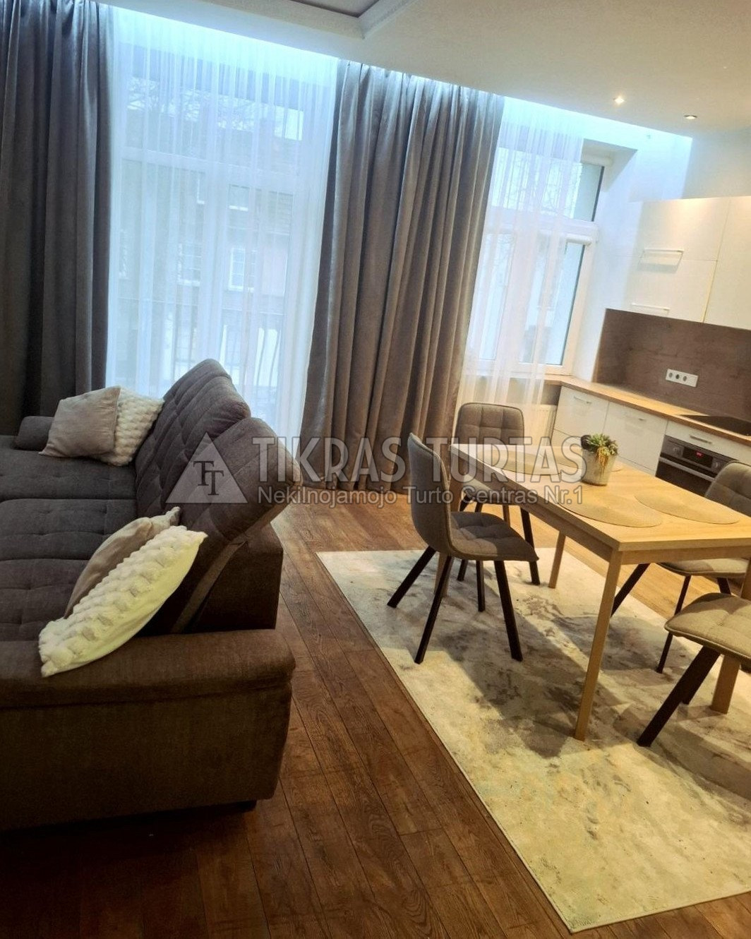 Butas pilnai įrengtas, su aukštomis lubomis, langai orientuoti į rytus, virtuvė sujungta su svetaine.